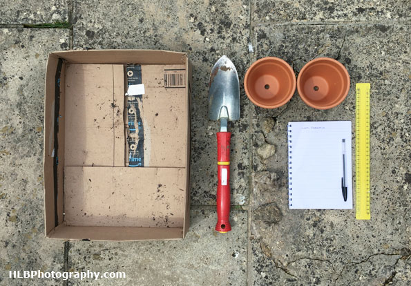 I collected together a trowel, a box, a couple of plant pots to use as containers, a 30cm ruler, 4 stones and pen & paper then headed off to dig a hole!