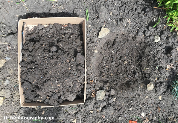 As I didn’t have any twigs to mark out the corners of my 30cm square I roughly marked it with a few stones and got digging! What I hadn’t taken into consideration was the bed wasn’t flat so everything was at a bit of an angle!