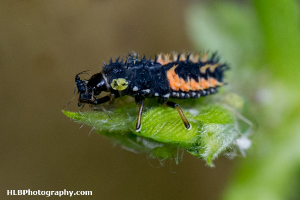 Once I was back in my own garden I noticed I had a harlequin ladybird larvae on me, I knew there was blackfly and greenfly on the runner beans so I thought that would be a good place to relocate him. I didn’t expect him to start eating them straight away. I have never seen them feeding before π
